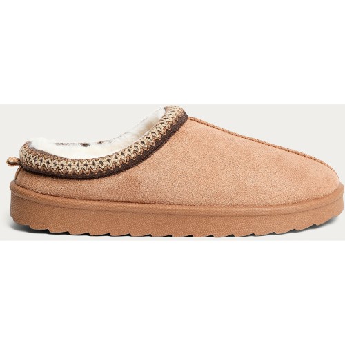 F&F Faux Fur Lined Embroidered Mule Slippers in Tan