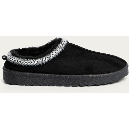 Faux Fur Lined Embroidered Mule Slippers in Tan