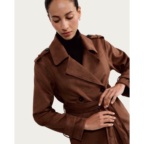 Faux Suede Double Breasted Longline Trench Coat in Brown