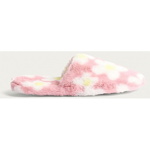 Faux Fur Daisy Print Mule Slippers in Pink