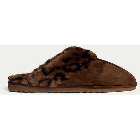 Leopard Print Faux Fur Trim Mule Slippers in Brown