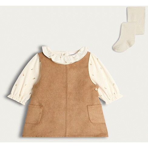 3-Piece Faux Suede Pinafore Bodysuit and Tight Set in Brown