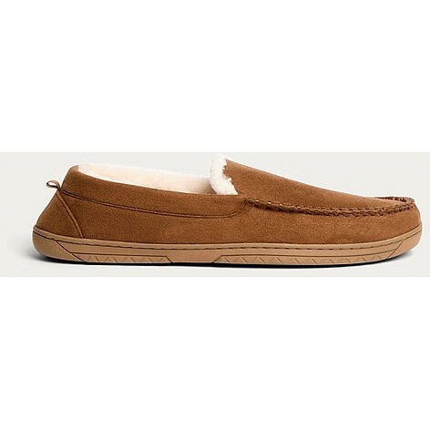 Faux Suede Fur Lined Moccasin Slippers in Tan