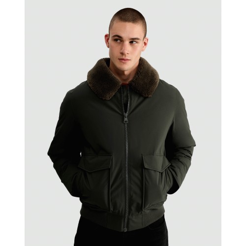 Faux Shearling Collar Shower Resistant Bomber Jacket in Khaki