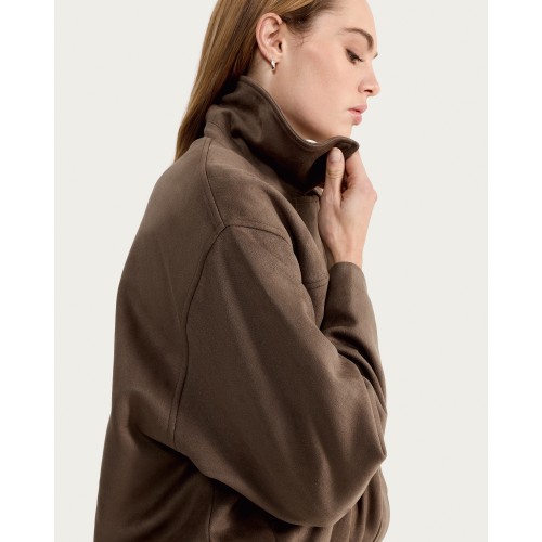 Faux Suede Zip Up Drawstring Jacket in Brown