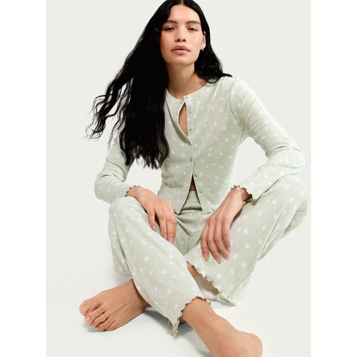 Pointelle Floral Button Up Long Sleeved Pyjama Cardigan in Green