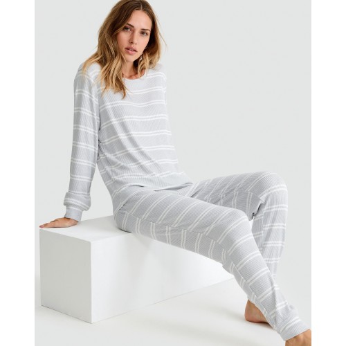 Ribbed Stripe Print Long Sleeved Top and Joggers Pyjamas in Grey