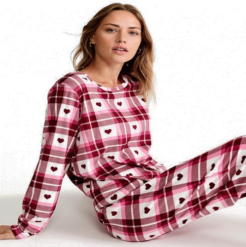 Fleece Heart Check Print Top and Bottoms Pyjamas in Red