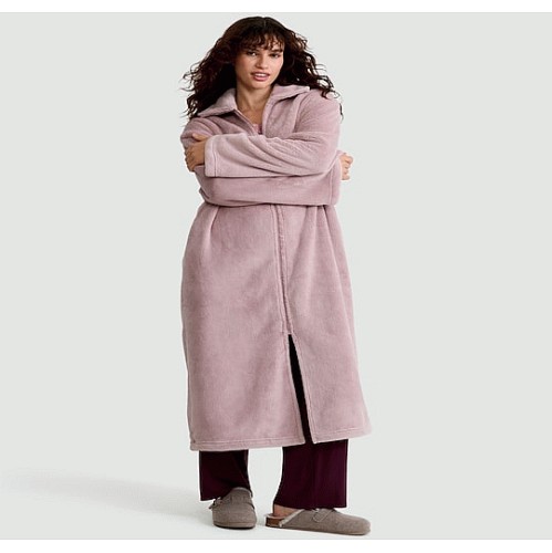 Fleece Hooded Zip Up Dressing Gown in Camel