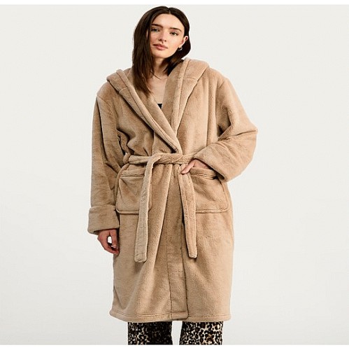 Fleece Hooded Zip Up Dressing Gown in Camel