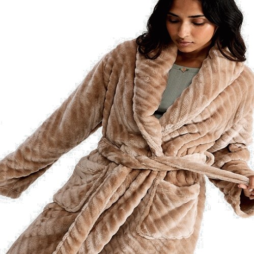 Fleece Textured Striped Dressing Gown in Camel