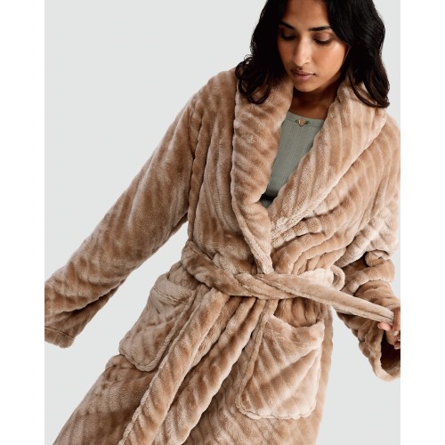 Fleece Textured Striped Dressing Gown in Camel