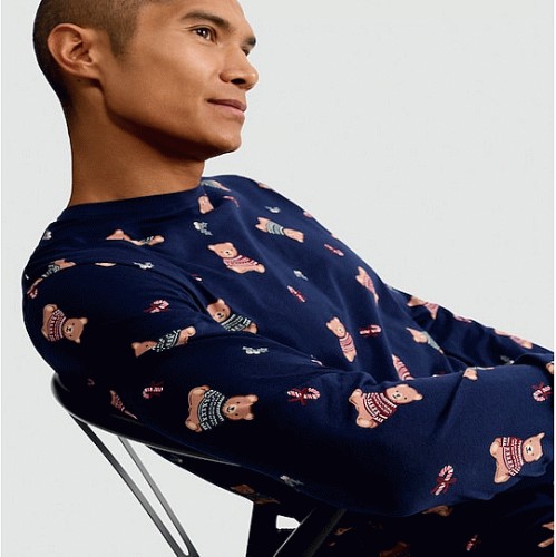 Fleece Textured Teddy Bear Print Christmas Pyjamas in Navy