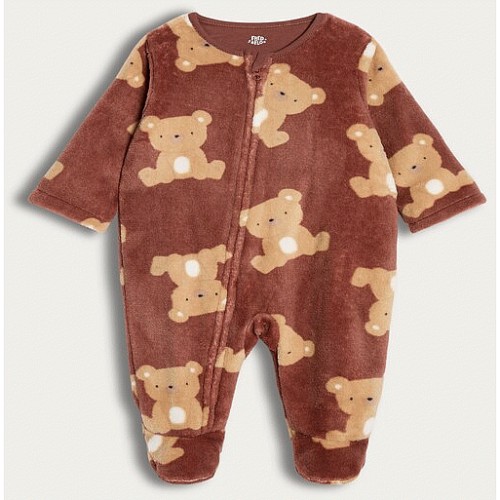 Soft Touch Fleece Teddy Bear Print Sleepsuit in Brown