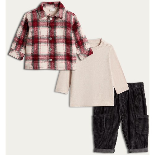 3-Piece Check Shacket Top and Corduroy Trousers Set in Red