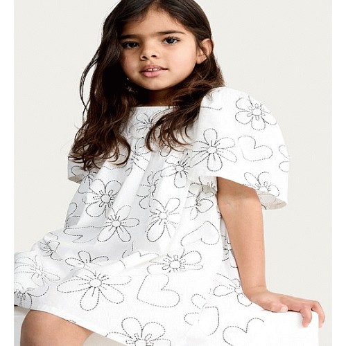 F&F Girls Pure Cotton Floral and Heart Embroidered Puff Sleeved Dress in White