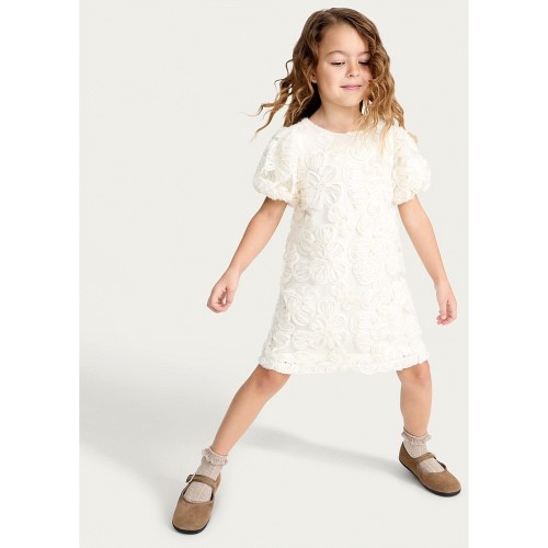 F&F Girls Floral Applique Puff Sleeved Dress in Cream