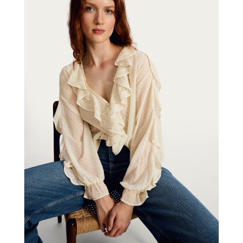 Woven Dobby Textured Ruffle Detail Blouse in Cream