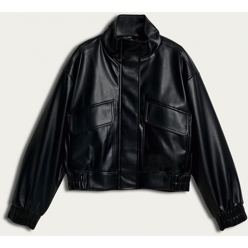 Faux Leather Funnel Neck Jacket in Black