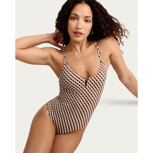 Geometric Print Cut Out Plunge Swimsuit in Multi Brown