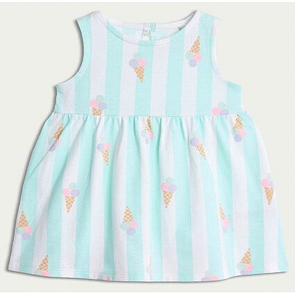 Pure Cotton Striped Ice Cream Print Sleeveless Dress in Green