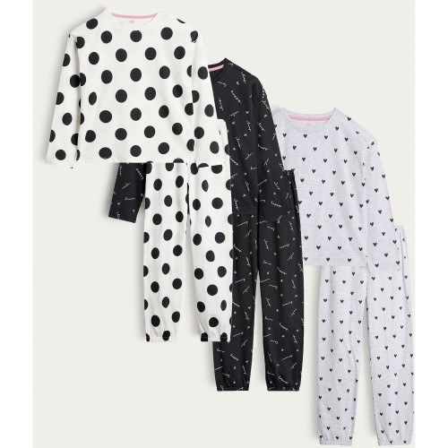 Girls 3-Pack Cotton Rich Polka Dot and Heart Print Pyjamas in Black Multi