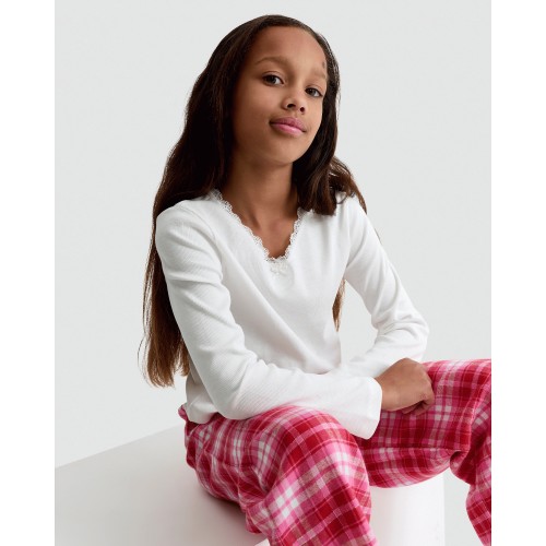 Girls Cotton Rich Lace Trim Top and Check Bottoms Pyjama Set in Cream Multi