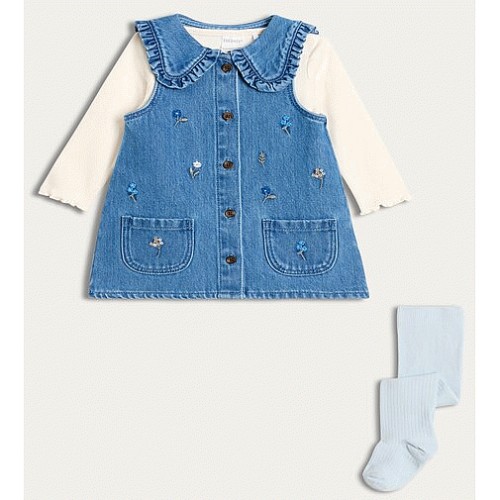 3-Piece Cotton Rich Denim Pinafore Bodysuit and Tights Set in Blue