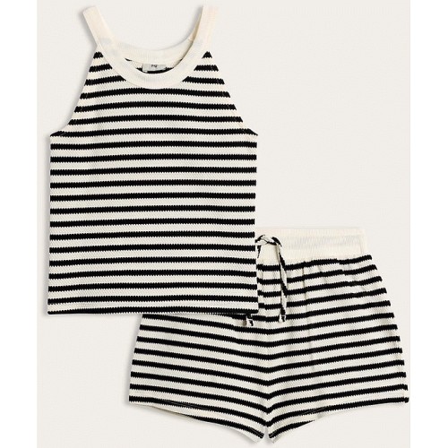 F&F Girls 2-Piece Cotton Rich Textured Striped Vest and Shorts Set in Multi Black White