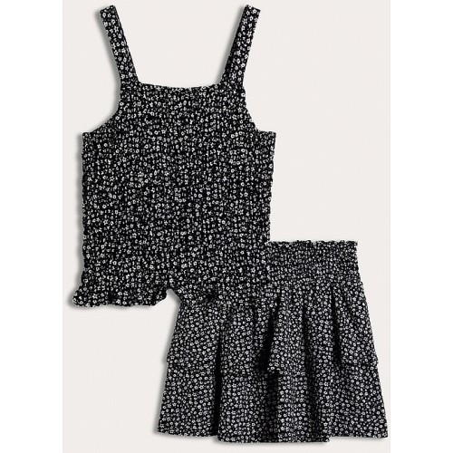 F&F Girls 2-Piece Crinkle Textured Floral Print Top and Skirt Set in Multi Black White
