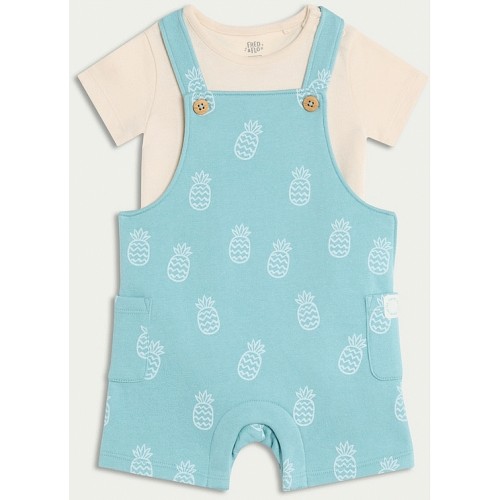 2-Piece Cotton Rich Printed Dungarees and Bodysuit Set in Turquoise