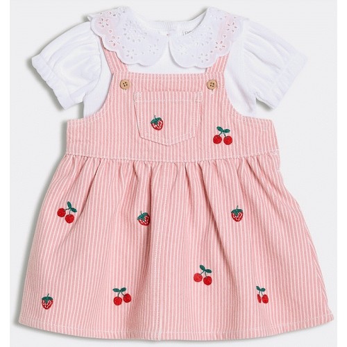 2-Piece Pure Cotton Striped Embroidered Pinafore and Bodysuit Set in Pink