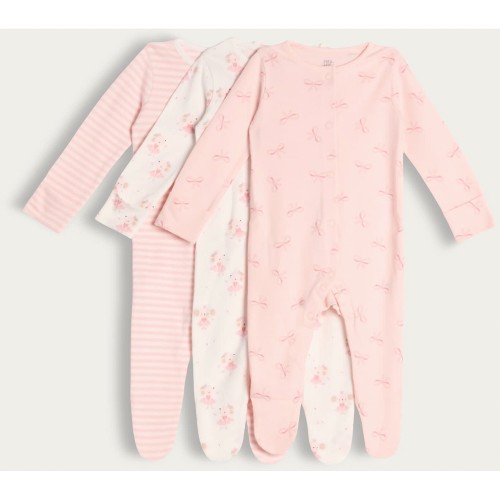 3-Pack Pure Cotton Ballerina Printed Sleepsuits in Pink