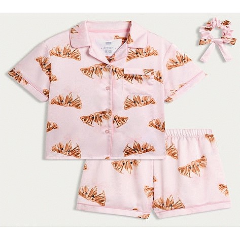 Girls 3-Piece Satin Croissant Print Pyjama Set with Scrunchie in Pink