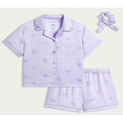 Girls 3-Piece Satin Bow Print Pyjama Set with Scrunchie in Multi