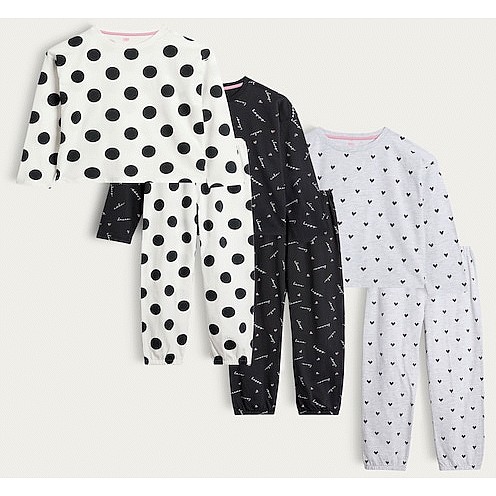 Girls 3-Pack Cotton Rich Polka Dot and Heart Print Pyjamas in Black Multi