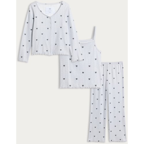 Girls 3-Piece Pointelle Bow Print Pyjama Set in Grey