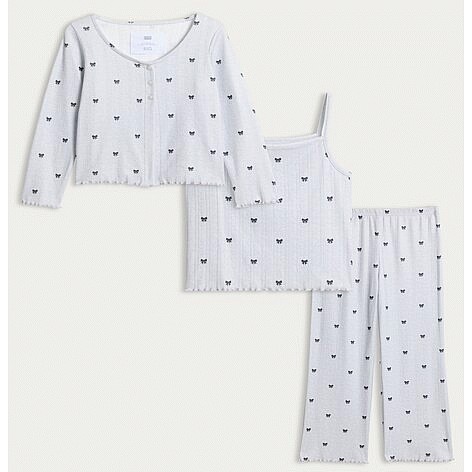 Girls 3-Piece Pointelle Bow Print Pyjama Set in Grey