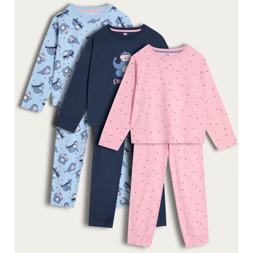 Girls 3-Pack Pure Cotton Printed Pyjama Set in Blue Multi