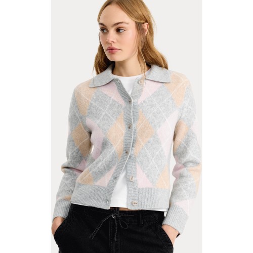 Knitted Argyle Print Button Up Cardigan in Multi Grey