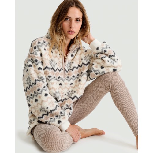 Borg Fair Isle Half Zip Jumper and Ribbed Leggings Pyjama in Cream