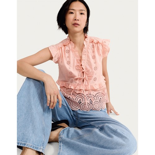 Pure Cotton Broderie Sleeveless Blouse in Coral