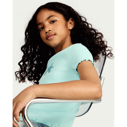 F&F Girls Cotton Rich Ribbed Hibiscus Embellished T-Shirt in Pink