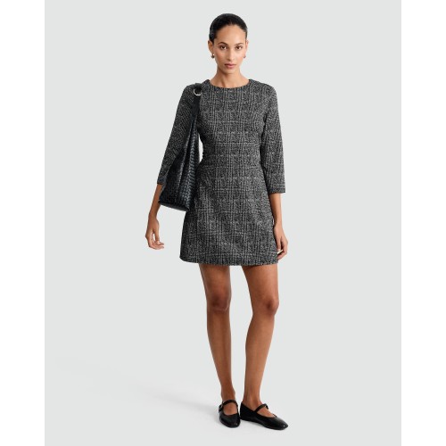 Textured Check Print Long Sleeved Shift Dress in Multi Black White