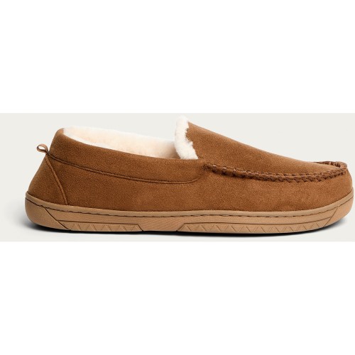 Faux Suede Fur Lined Moccasin Slippers in Tan
