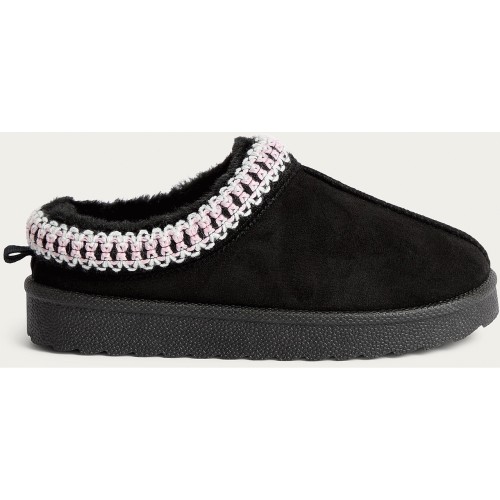 Girls Woven Trim Faux Fur Lined Chunky Slippers in Black