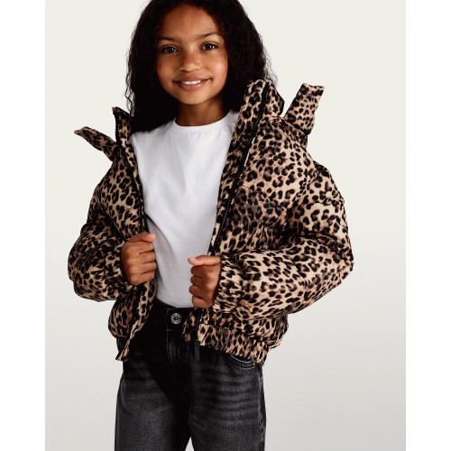 Leopard Print Shower Resistant Puffer Jacket in Multi Brown