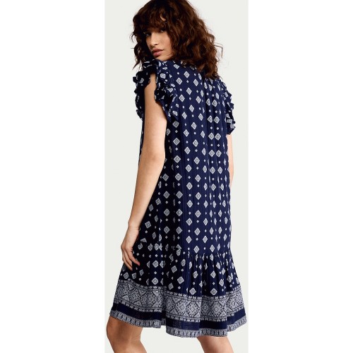 Pure Cotton Geometric Print Ruffle Sleeved Dress in Multi Blue