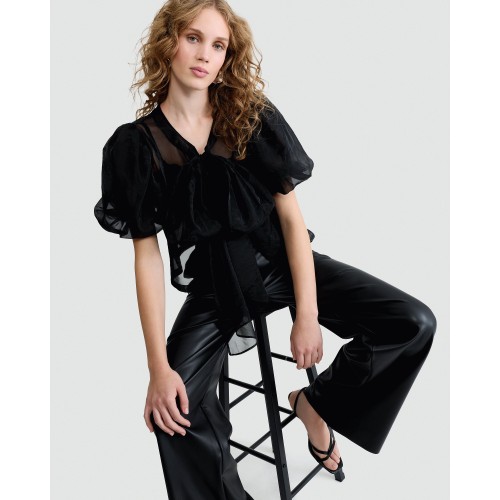 The F&F Edit Organza Puff Sleeved Bow Accent Blouse in Black