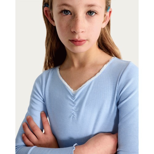 F&F Girls Ribbed Lace Trim Long Sleeved Top in Blue